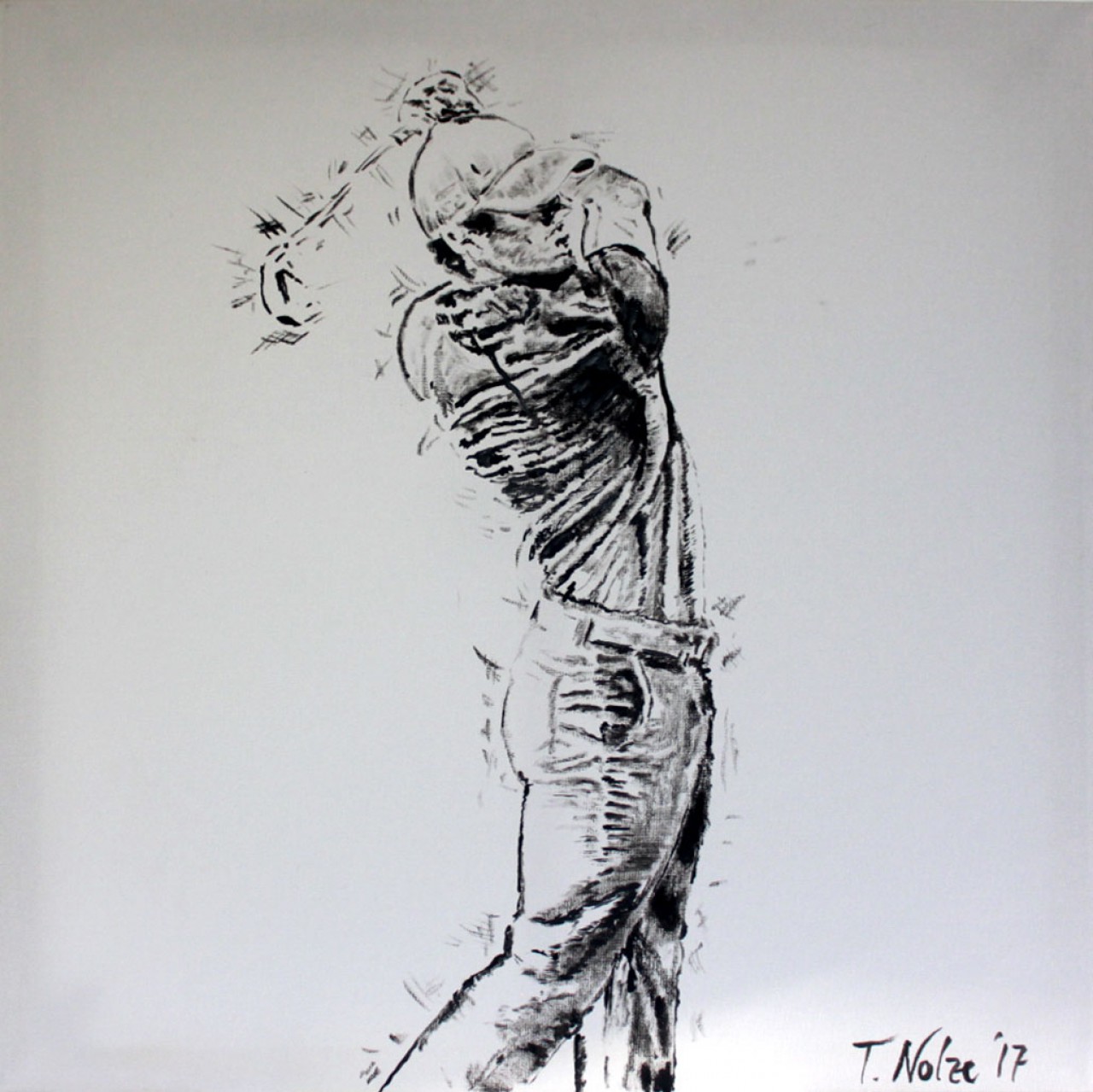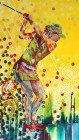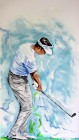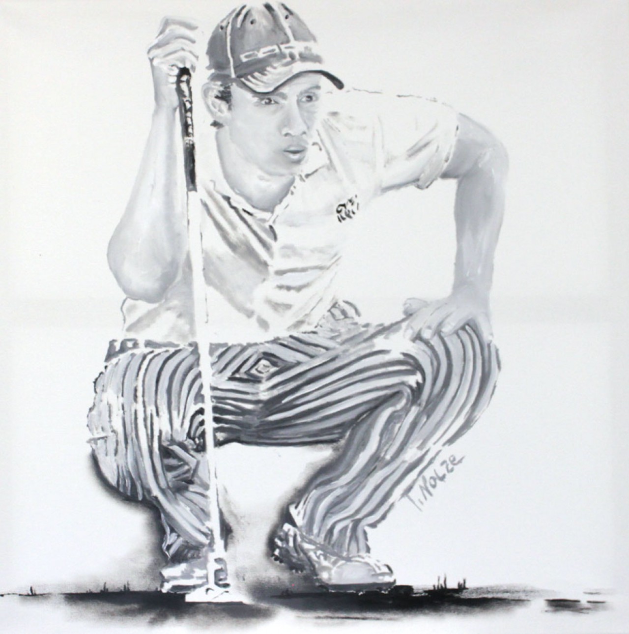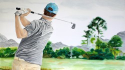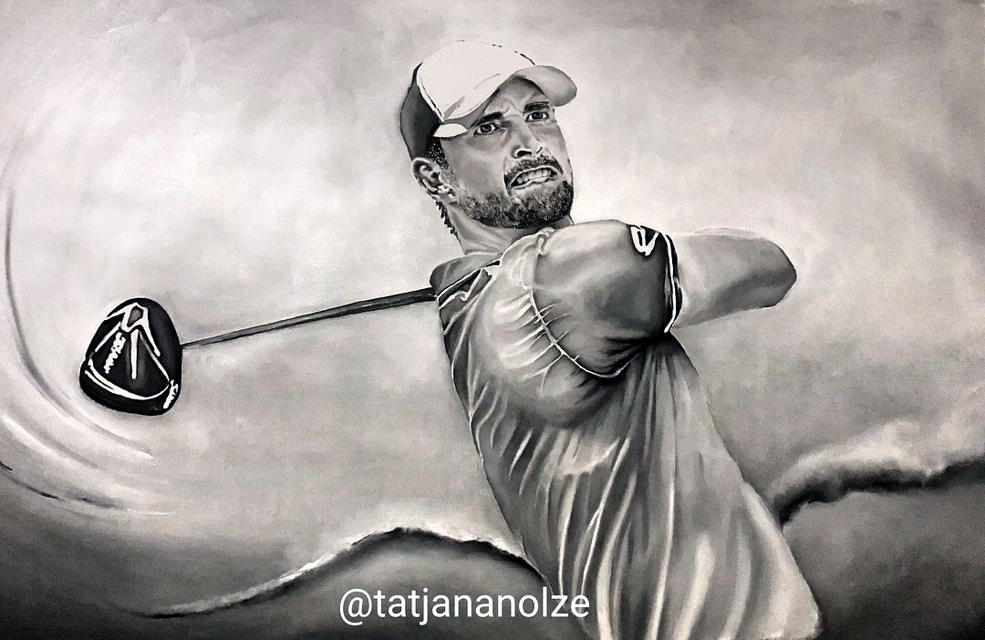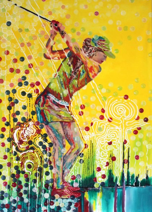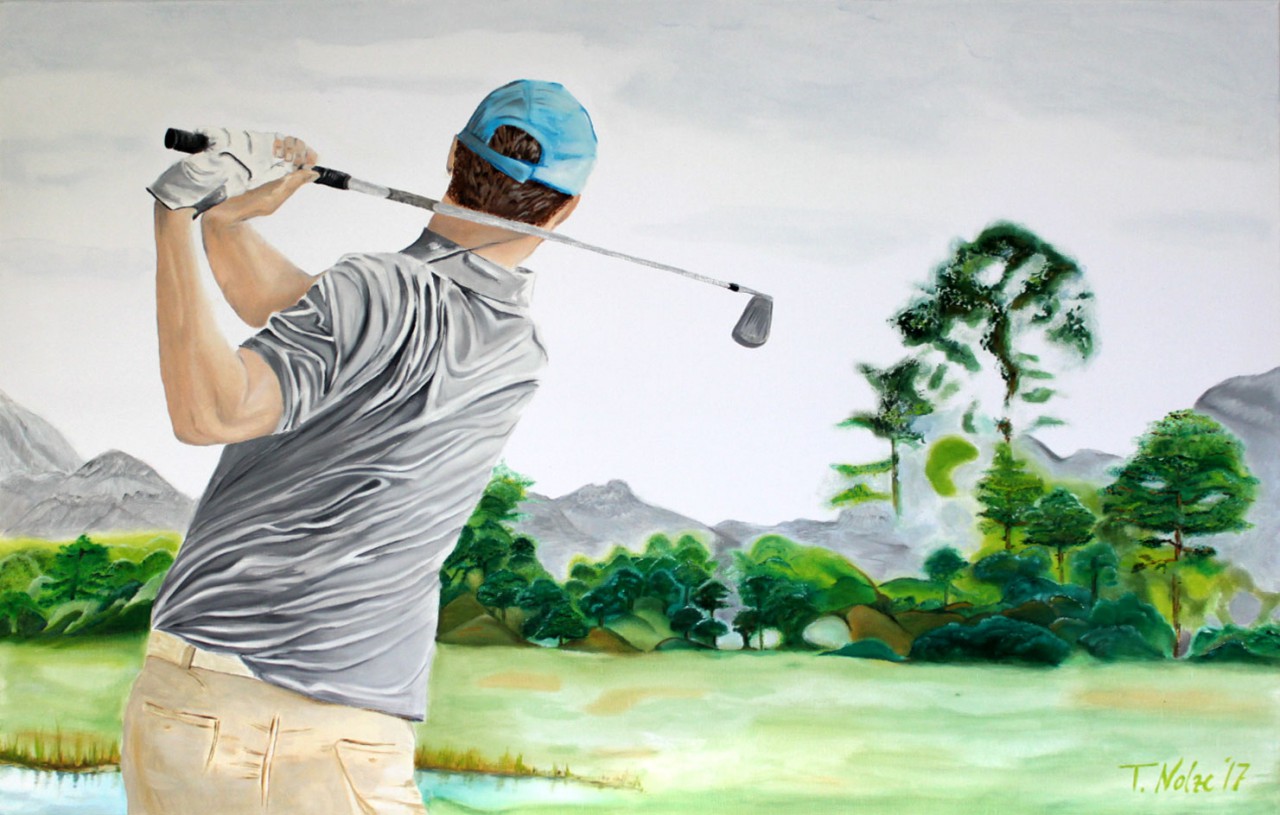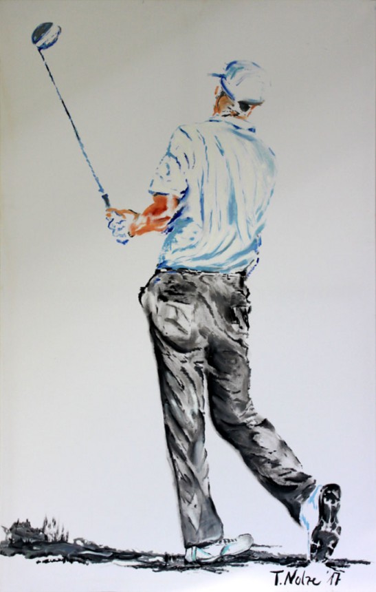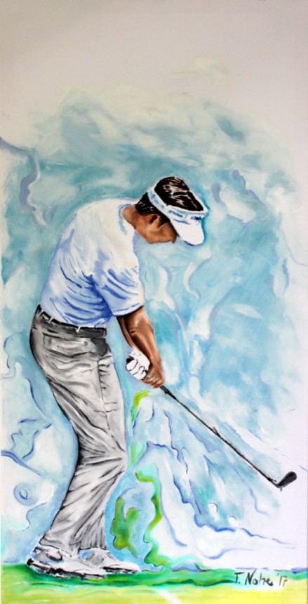 Die ästhetischen Schwungfolgen im Golf nehme ich als Hamburger Künstlerin sehr bewusst in mich auf. Mein geschärfter Blick für die Proportionen des Spielers in den verschiedenen Stellungen lässt mich die fließenden Bewegungen des Spielers auf die Leinwand übertragen und teilweise sogar abstrakte Ausdrucksformen annehmen, harmonisch auch dem Fluss im Farbspiel folgend.